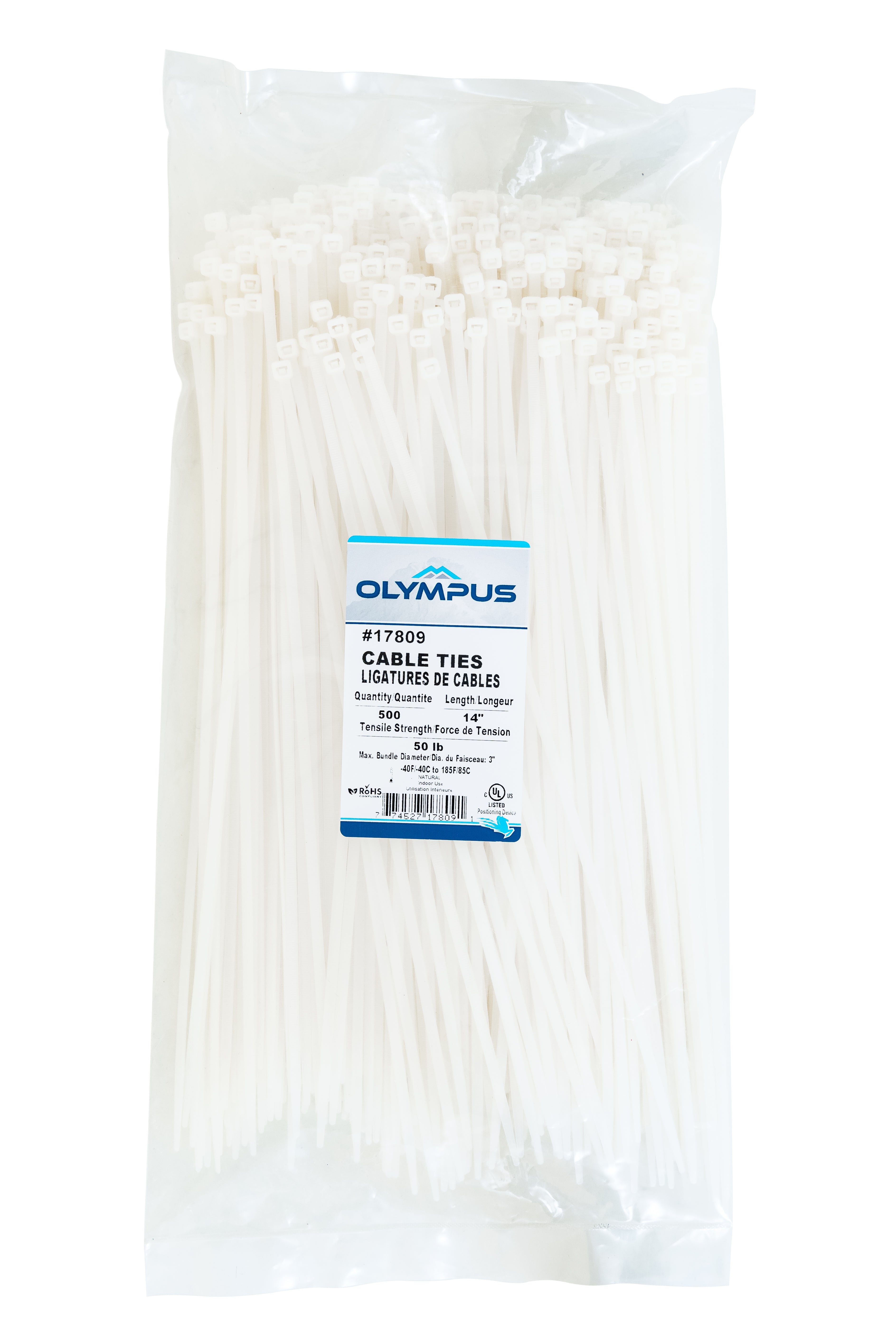 14" 50lb Natural Cable Ties. Each bag has 500 pieces and there are 10 bags per case. Minimum order of one case. For large orders, please contact us by clicking here.